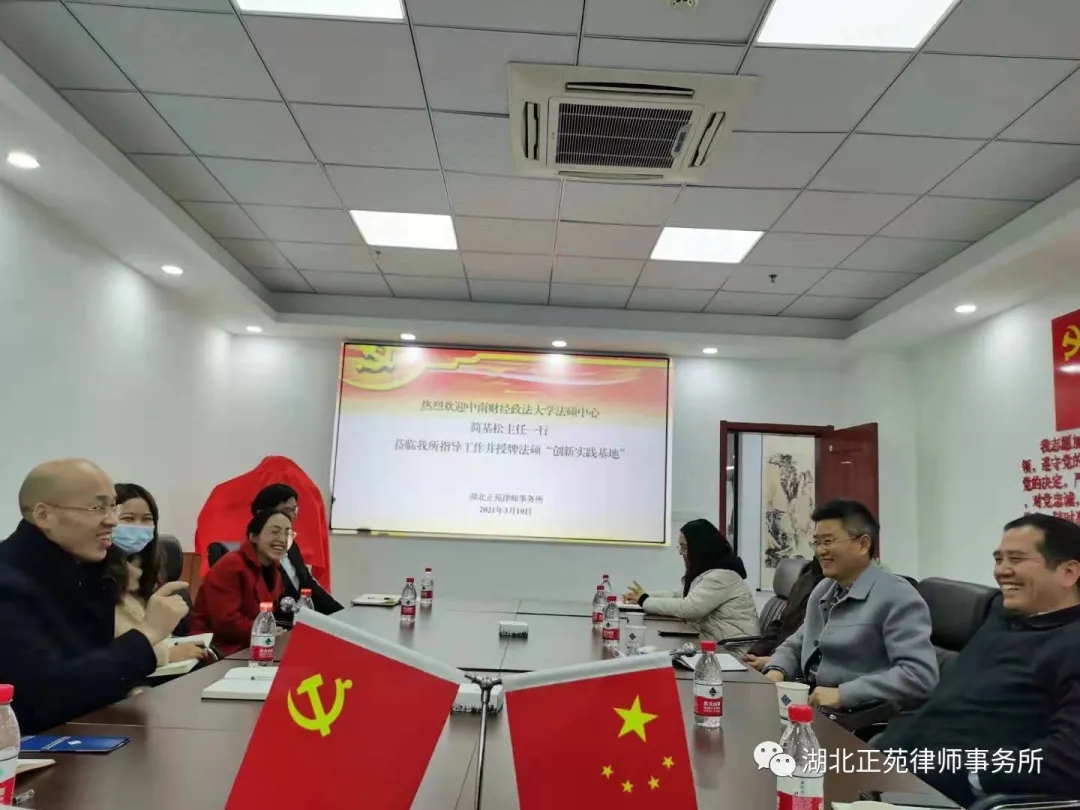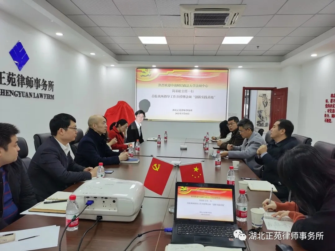 3月10日,春寒料峭,细雨淅沥,中南财经政法大学法硕中心主任简基松教授一行莅临我所指导工作。法硕中心在与我所签署长期战略合作协议以及遴选我所张静雨主任担任法律硕士导师基础上,正式授牌我所成为中南财经政法大学法律硕士研究生“实践创新基地”。